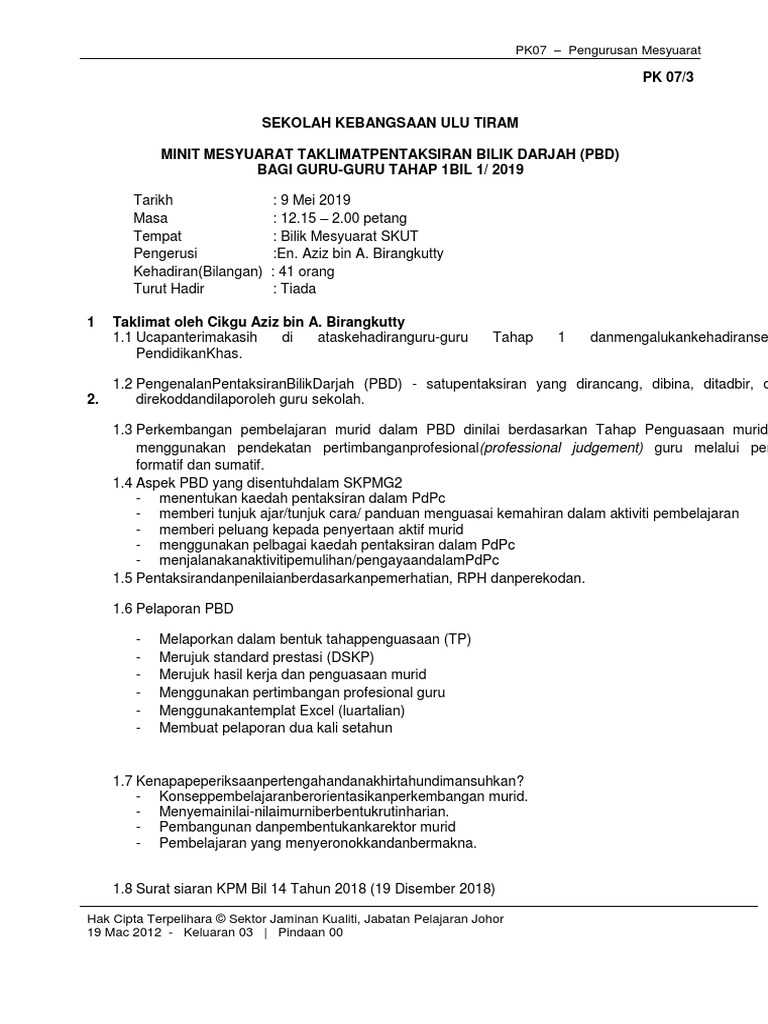 Jan 14 2018 - MINIT MESYUARAT PANITIA SEJARAH KALI PERTAMA 2015 SEKOLAH KEBANGSAAN KUALA BOK BARAM. PBD Puan Nurfadhlinallyani memaklumkan laporan pentaksiran bilik darjah untuk tahap 1 dan tahap 2 hendaklah diisi oleh semua guru matapelajaran. 29 Jun 2020 Hari.