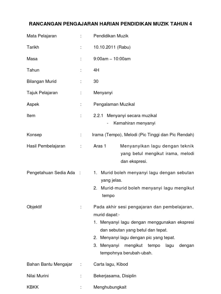 Rancangan Pengajaran Harian Pendidikan Muzik Tahun 4 Pdf
