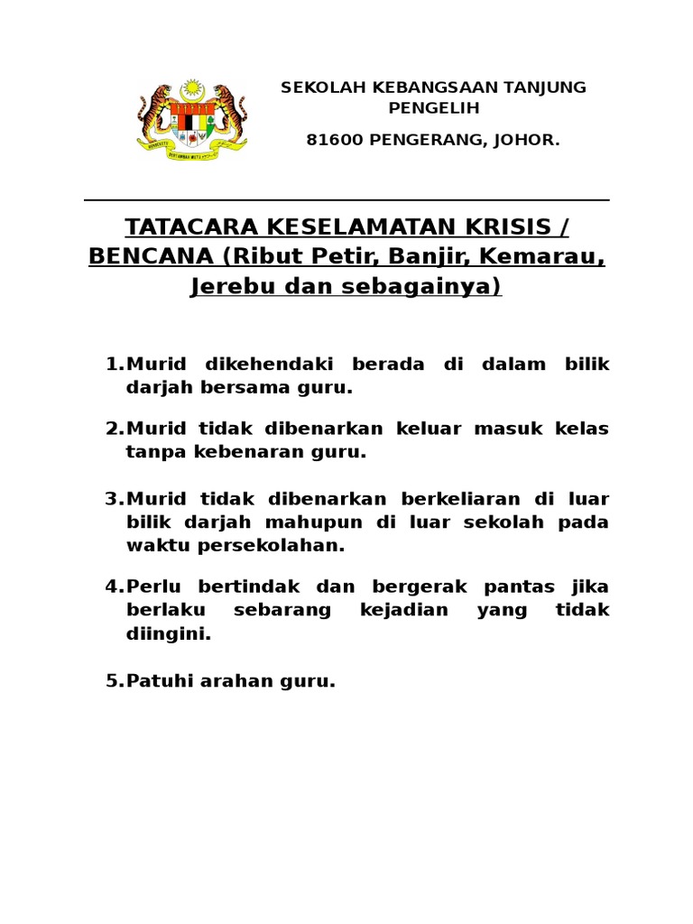 Membawa buku dan alat-alat yang diperlukan sewaktu sesi pembelajaran. 03122011 Polisi Keselamatan Kegiatan Luar Bilik Darjah. - Menetapkan darjah keselamatan untuk dilaksanakan oleh semua jabatan Kerajaan.