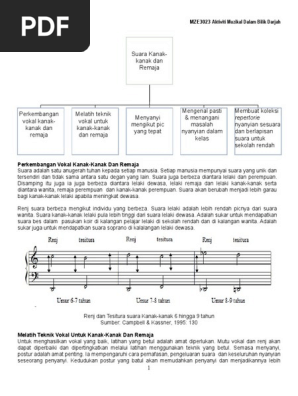 Ataupun di dalam atau di lu ar bilik darjah serta mening katkan minat kanak-kanak. Didapati bahawa lagu dan aktiviti pergerakan merupakan cara yang berkesan untuk memperoleh bahasa bagi seseorang kanak-kanak yang suka menyanyi dan bergerak. Renj suara register suara koir.
