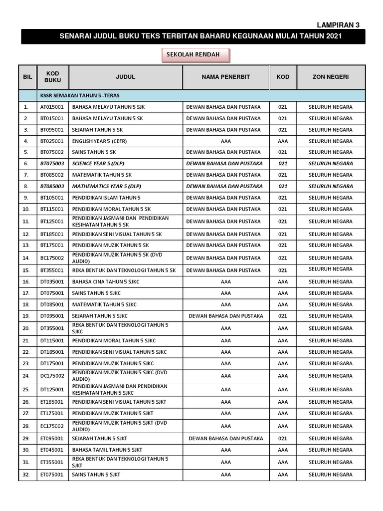 6 Senarai Judul Buku Teks Terbitan Baharu Btb Kegunaan Tahun 2021 Pdf